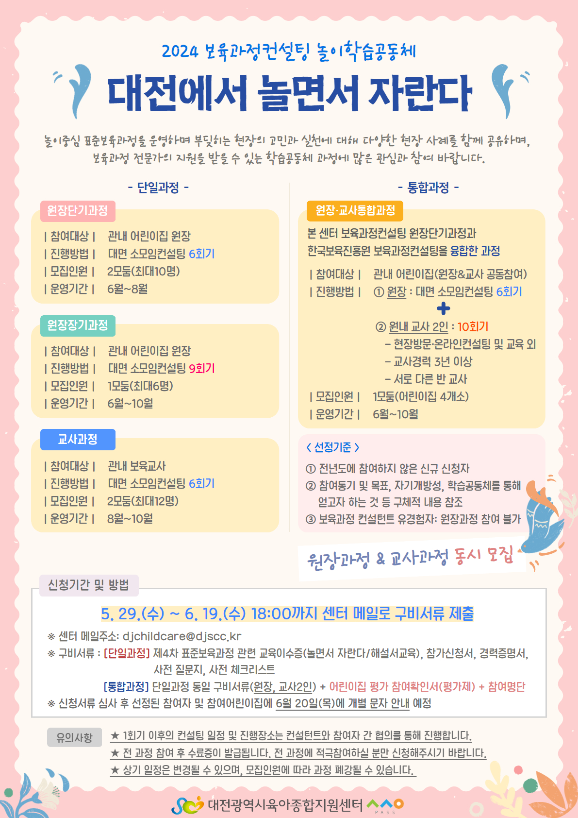 본 센터에서는 2024년 보육과정컨설팅 놀이학습공동체「대전에서 놀면서 자란다」참여자를 모집합니다. 원장과정과 교사과정 참여자 동시모집 후 6월 원장과정 > 8월 교사과정으로 순차진행합니다. 금년도에는 원장·교사통합과정이 신규 개설되었으니 자세한 내용은 첨부파일을 참조해주십시오. 관내 원장 및 보육교사분들의 많은 관심과 참여 바랍니다. ※ 일정은 진행상황에 따라 조정될 수 있습니다.