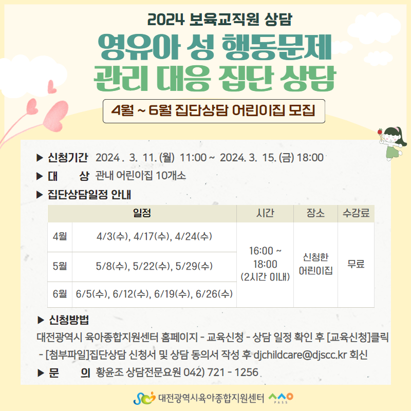 | 제목 | 2024년 영유아 성 행동문제 관리 대응 집단상담(5.29.수.) | ||