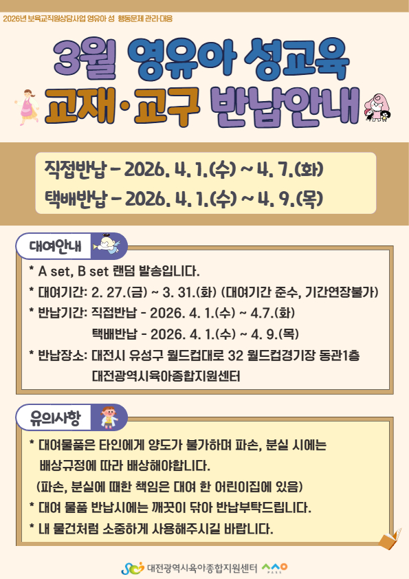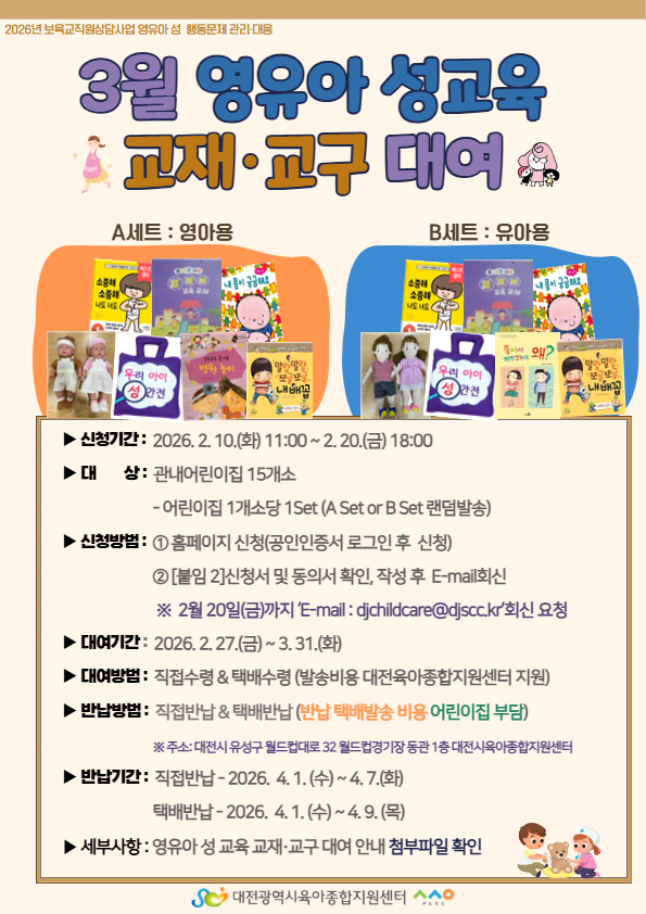 | 제목 | 2026년 3월 영유아 성교육 교재교구 대여 | ||
